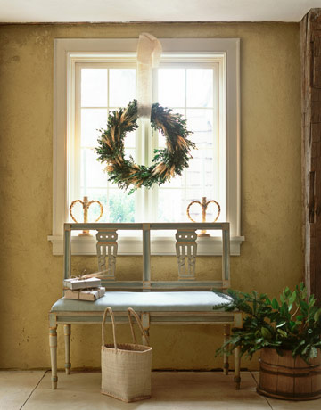 {I love this image from Country Living where they adorn an old wood farm antique with greenery...a clever wreath with tremendous personality!}